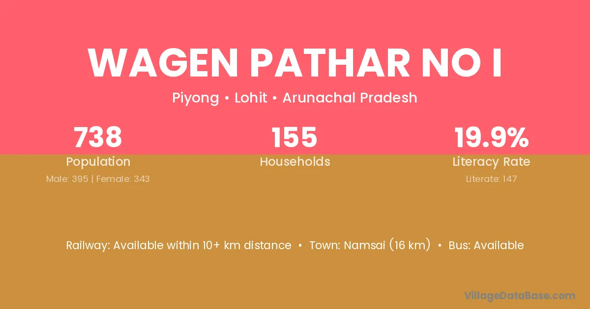 Namsai (16 km) is the nearest town to Wagen Pathar No I village for major economic activities and is located approximately 16 km away.