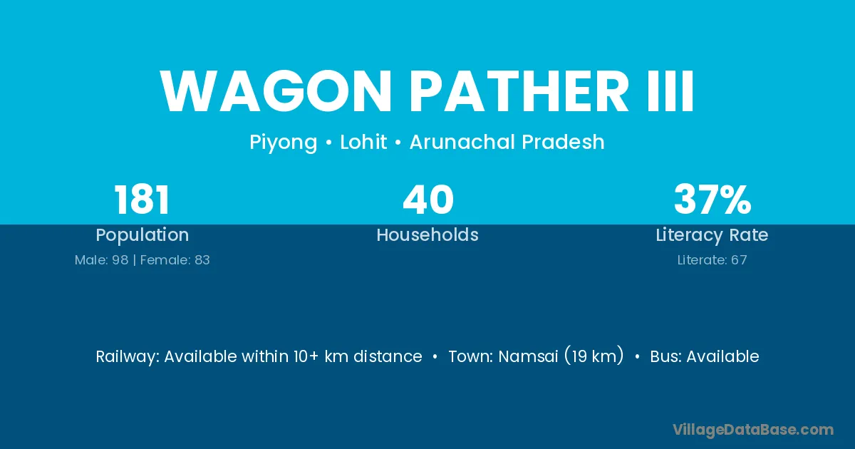 Namsai (19 km) is the nearest town to Wagon Pather Iii village for major economic activities and is located approximately 19 km away.