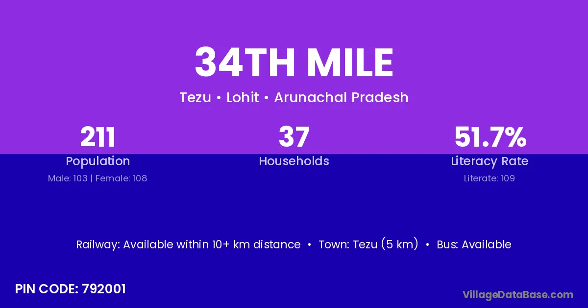 Tezu (5 km) is the nearest town to 34th Mile village for major economic activities and is located approximately 5 km away.