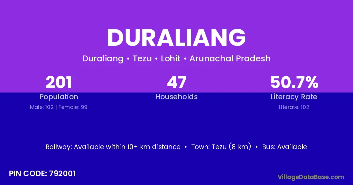 Tezu (8 km) is the nearest town to Duraliang village for major economic activities and is located approximately 8 km away.