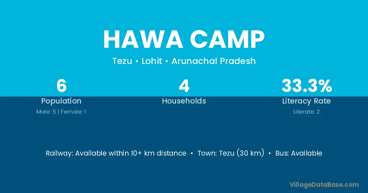 Tezu (30 km) is the nearest town to Hawa Camp village for major economic activities and is located approximately 30 km away.