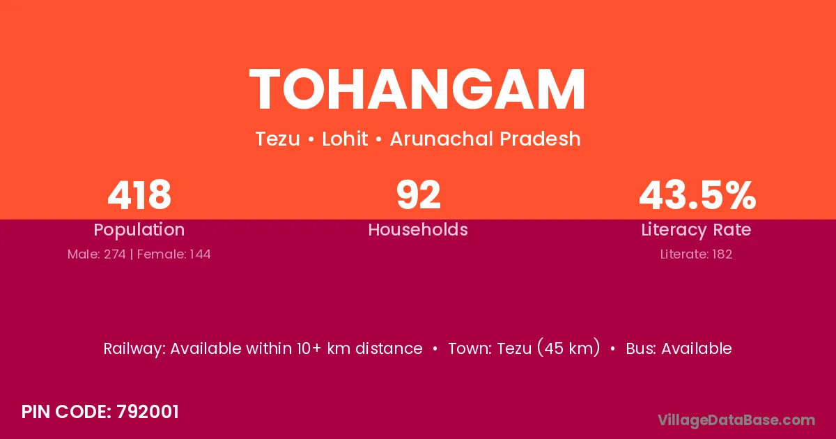 Tezu (45 km) is the nearest town to Tohangam village for major economic activities and is located approximately 45 km away.