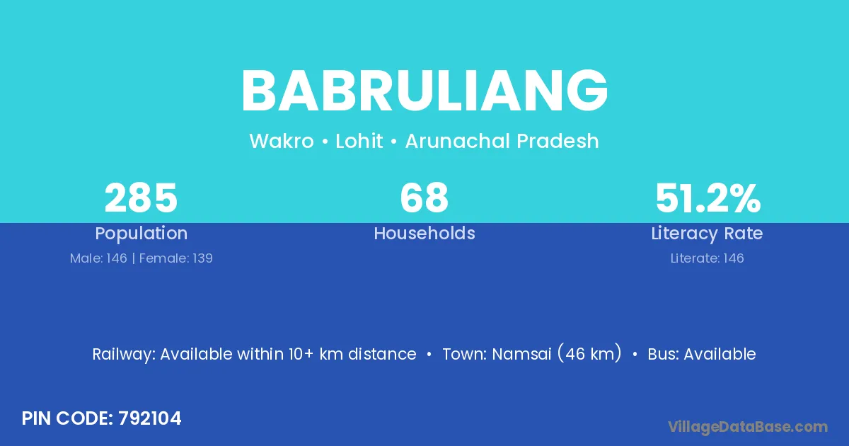 Namsai (46 km) is the nearest town to Babruliang village for major economic activities and is located approximately 46 km away.