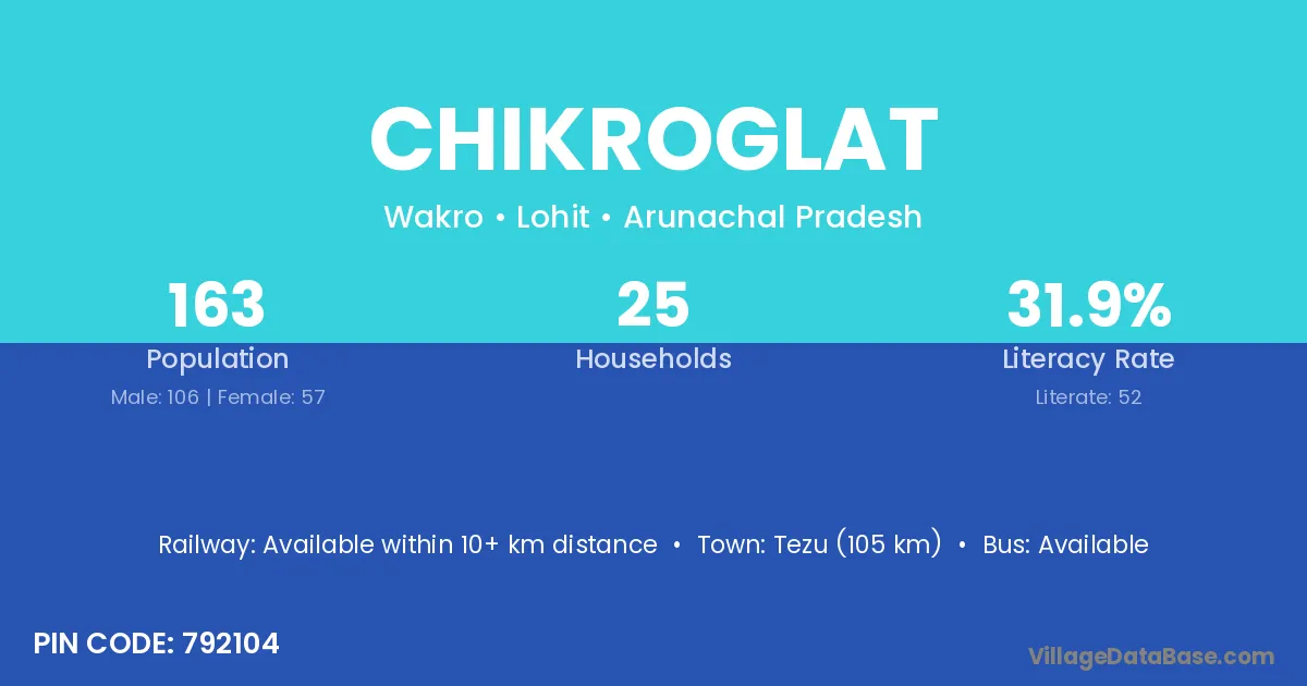 Tezu (105 km) is the nearest town to Chikroglat village for major economic activities and is located approximately 105 km away.