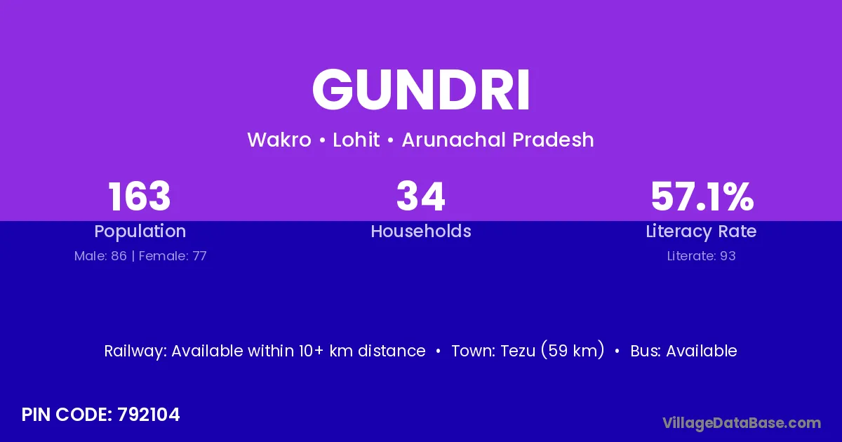 Tezu (59 km) is the nearest town to Gundri village for major economic activities and is located approximately 59 km away.