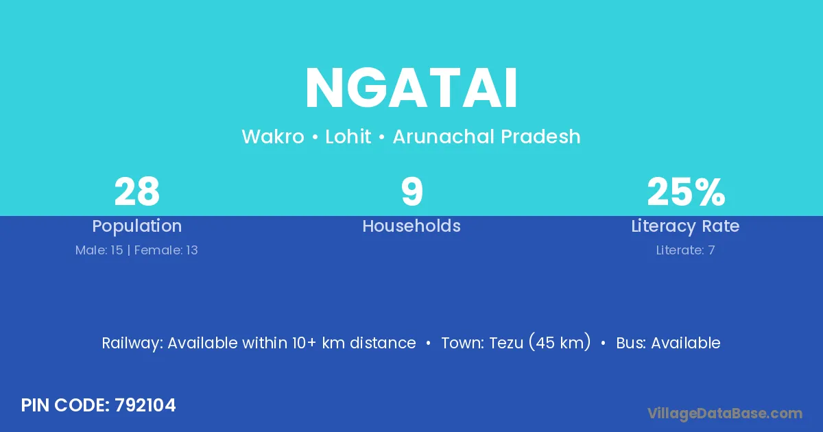 Tezu (45 km) is the nearest town to Ngatai village for major economic activities and is located approximately 45 km away.