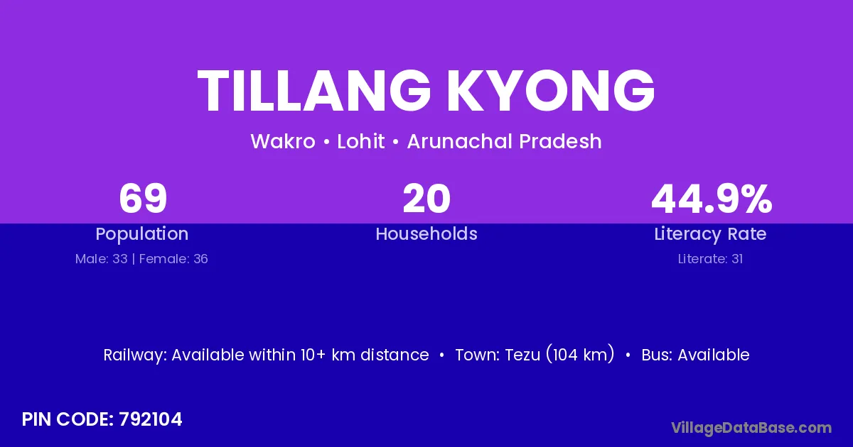 Tezu (104 km) is the nearest town to Tillang Kyong village for major economic activities and is located approximately 104 km away.