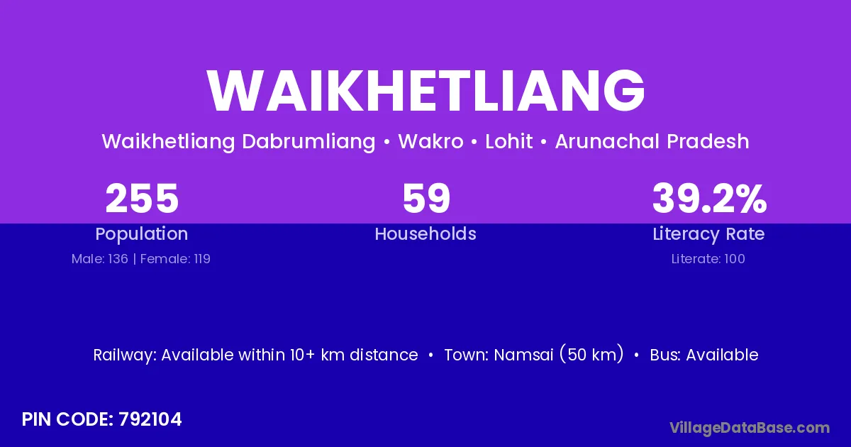 Namsai (50 km) is the nearest town to Waikhetliang village for major economic activities and is located approximately 50 km away.