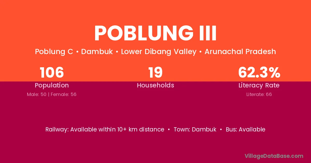 The literacy rate of Poblung Iii village is 62.26%. Male literacy stands at 76.00% and female literacy at 50.00%.