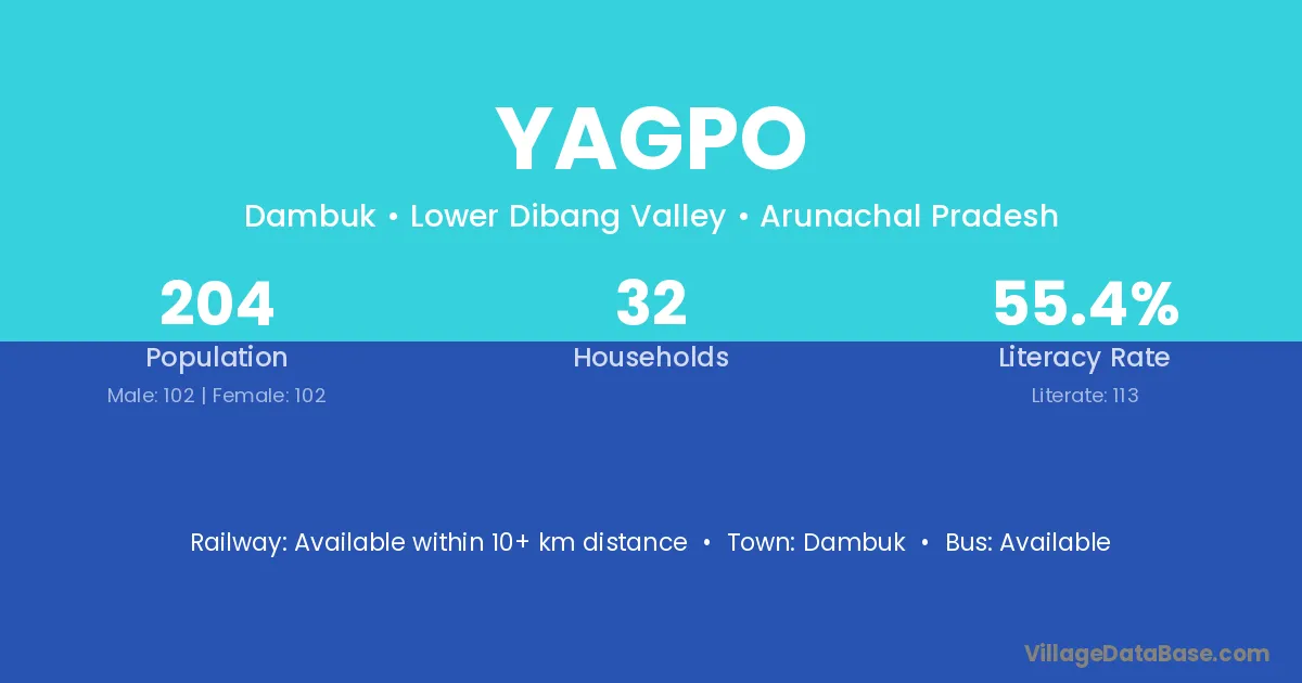 Yagpo village has a total population of 204 people, of which 102 are males and 102 are females.
