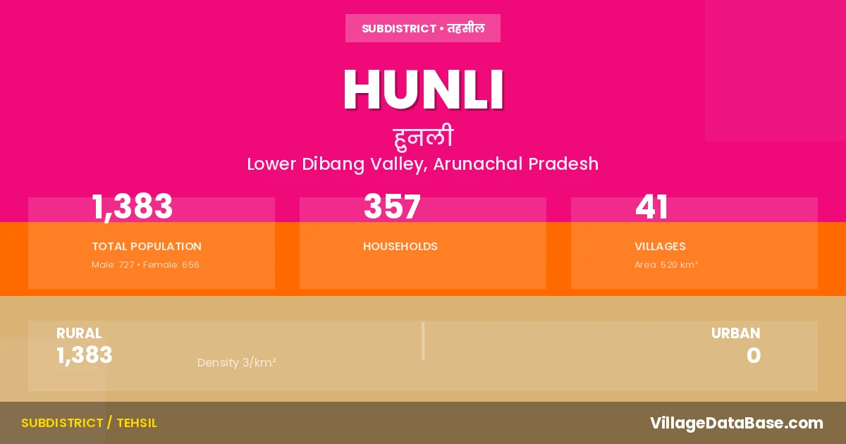 According to the 2011 census The total area of Hunli Circle is 520 km², with a population of 1383 people. The population density is 3 inhabitants per square kilometre, and there are approximately 357 houses in the sub district.