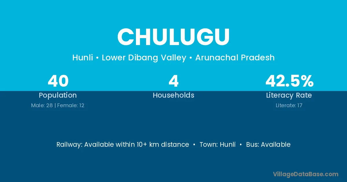 The literacy rate of Chulugu village is 42.50%. Male literacy stands at 42.86% and female literacy at 41.67%.