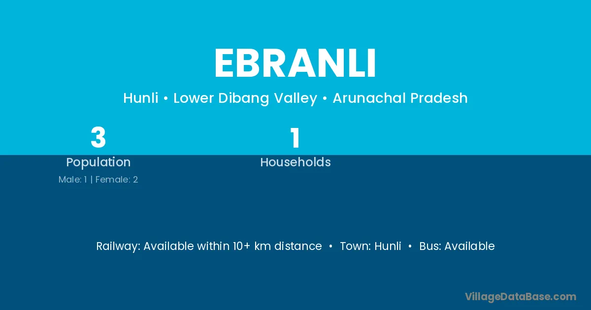 Ebranli village has a total population of 3 people, of which 1 are males and 2 are females.