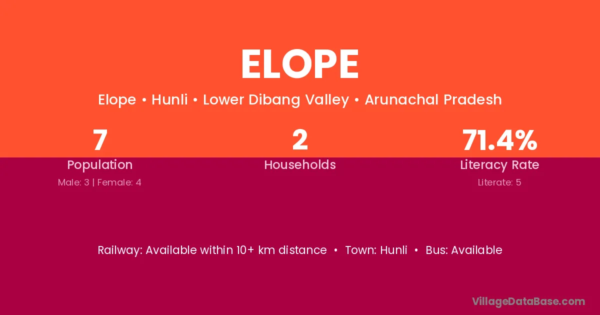 The literacy rate of Elope village is 71.43%. Male literacy stands at 33.33% and female literacy at 100.00%.