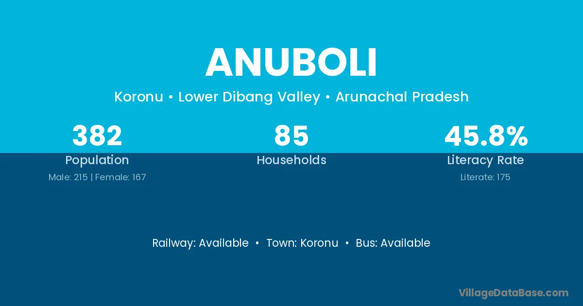Anuboli village has a total population of 382 people, of which 215 are males and 167 are females.