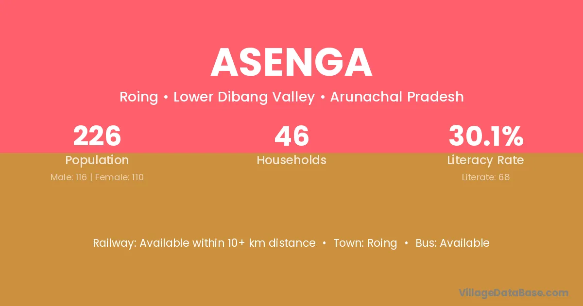 Asenga village has a total population of 226 people, of which 116 are males and 110 are females.