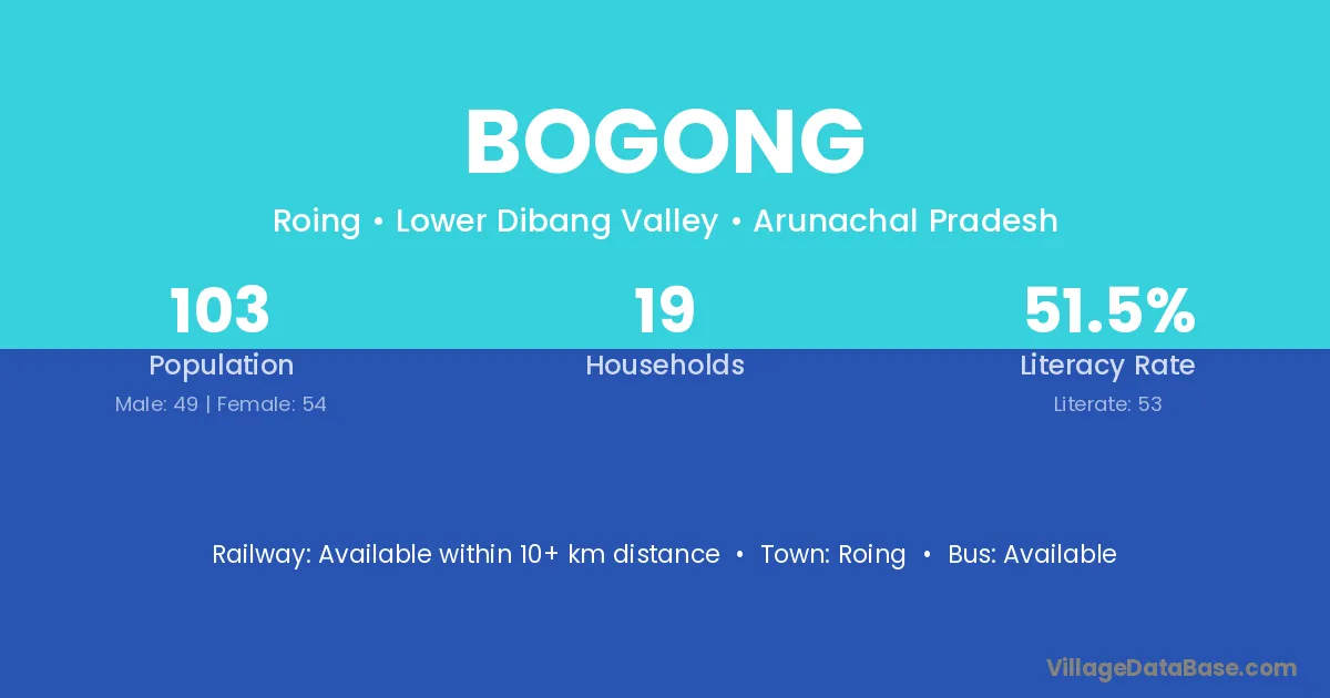 The literacy rate of Bogong village is 51.46%. Male literacy stands at 61.22% and female literacy at 42.59%.