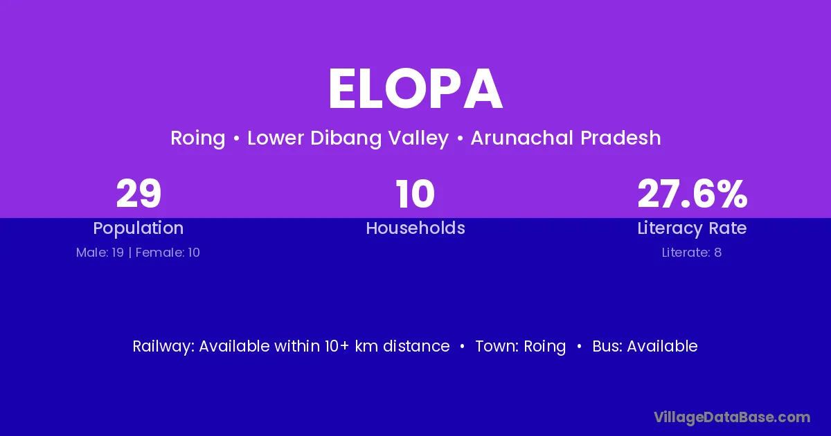 Elopa village has a total population of 29 people, of which 19 are males and 10 are females.