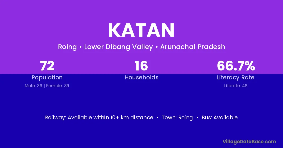 Katan village has a total population of 72 people, of which 36 are males and 36 are females.