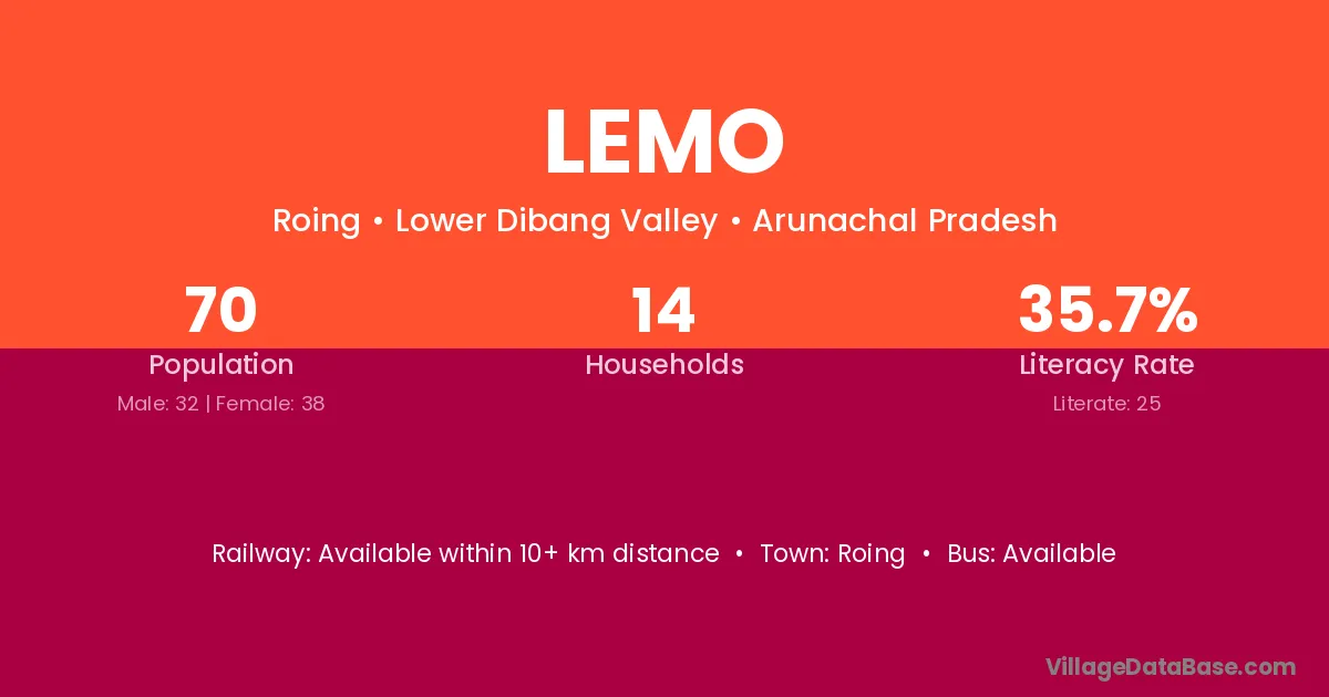 The literacy rate of Lemo village is 35.71%. Male literacy stands at 50.00% and female literacy at 23.68%.