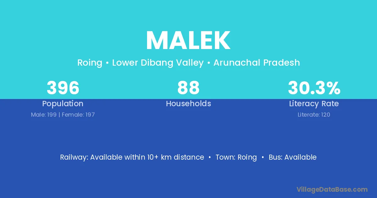 Malek village has a total population of 396 people, of which 199 are males and 197 are females.