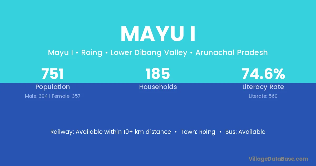 The literacy rate of Mayu I village is 74.57%. Male literacy stands at 77.41% and female literacy at 71.43%.