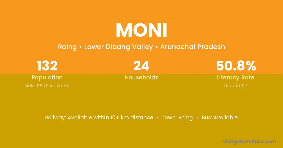 Moni village has a total population of 132 people, of which 68 are males and 64 are females.
