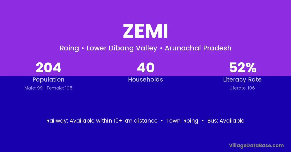 Zemi village has a total population of 204 people, of which 99 are males and 105 are females.