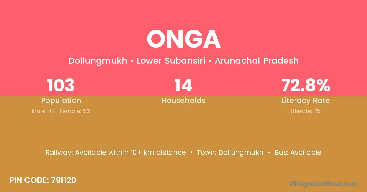 Onga village has a total population of 103 people, of which 47 are males and 56 are females.