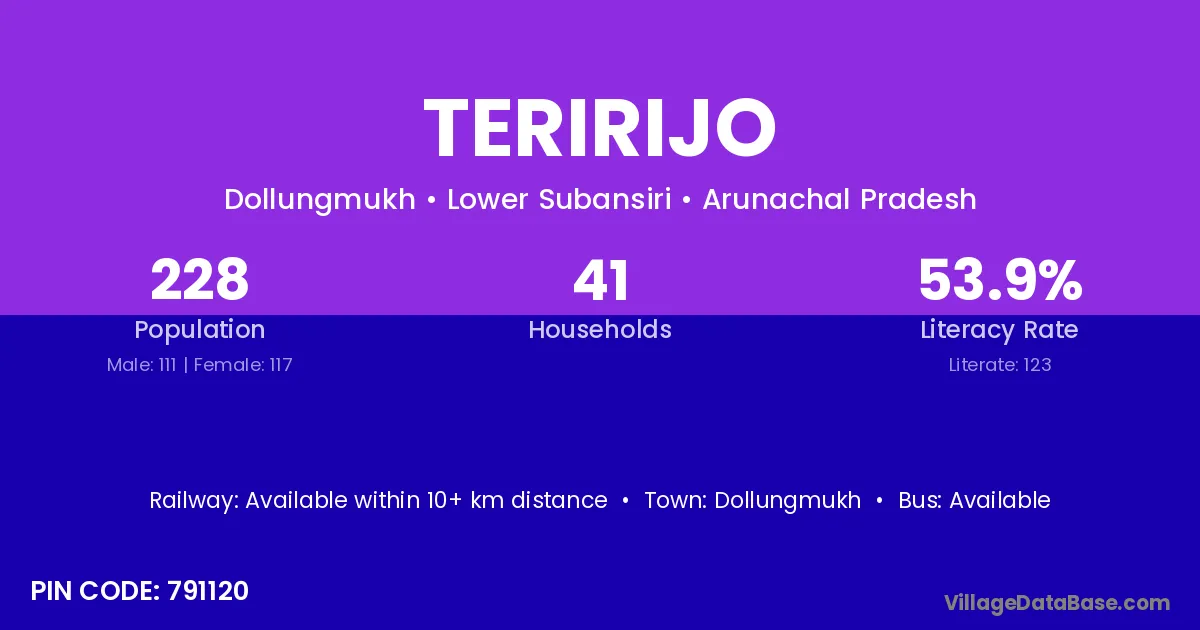 Teririjo village has a total population of 228 people, of which 111 are males and 117 are females.