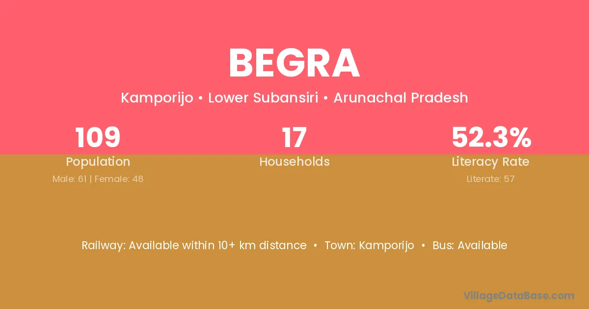 Begra village has a total population of 109 people, of which 61 are males and 48 are females.