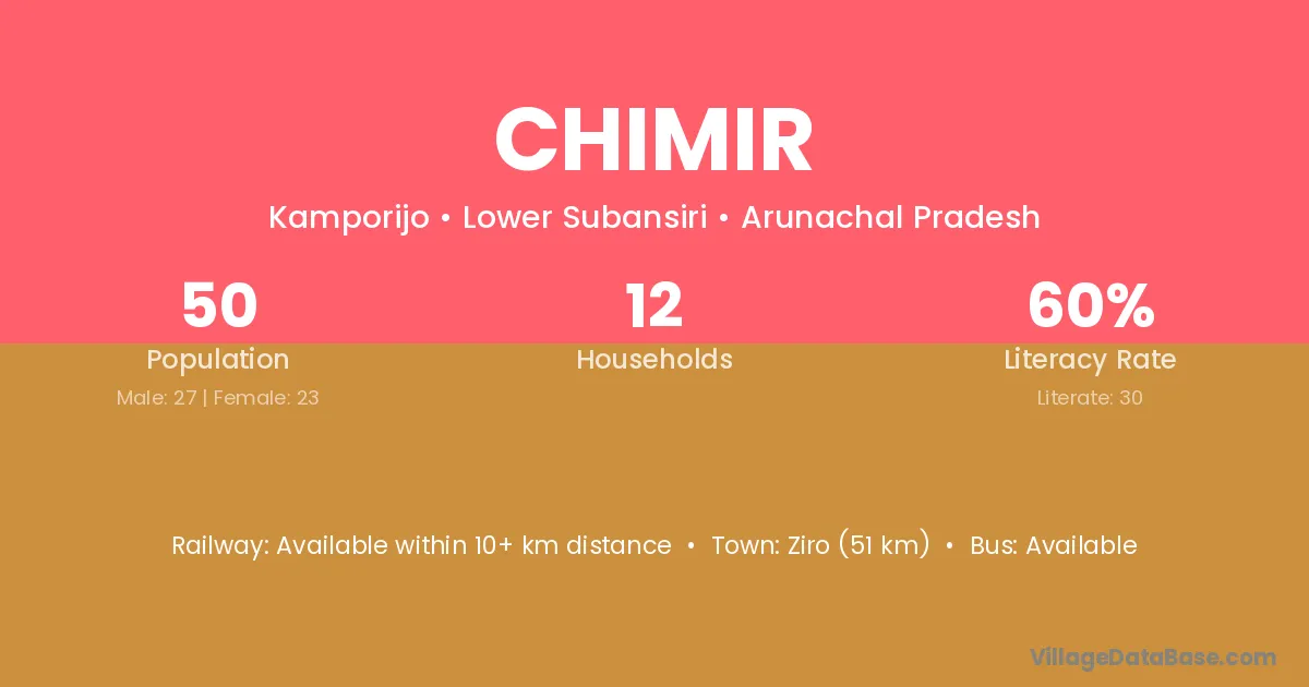 Ziro (51 km) is the nearest town to Chimir village for major economic activities and is located approximately 51 km away.