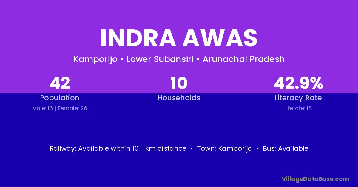 Indra Awas village has a total population of 42 people, of which 16 are males and 26 are females.