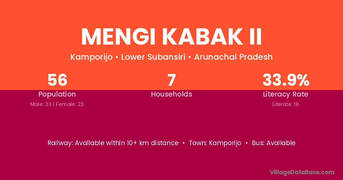 Mengi Kabak Ii village has a total population of 56 people, of which 33 are males and 23 are females.