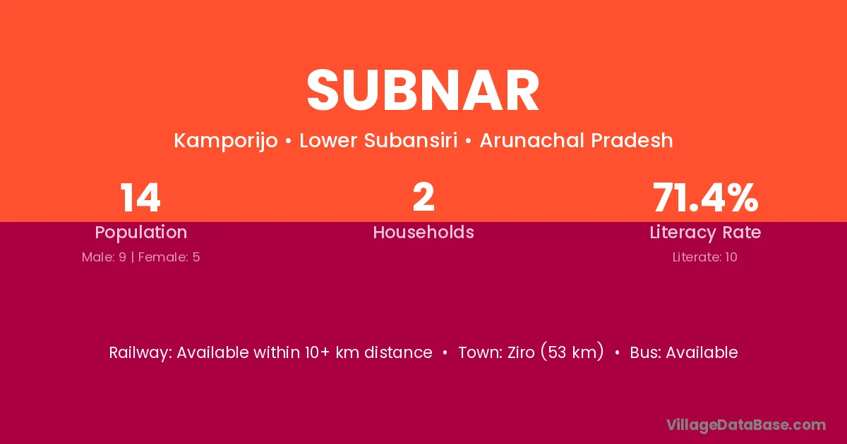Ziro (53 km) is the nearest town to Subnar village for major economic activities and is located approximately 53 km away.