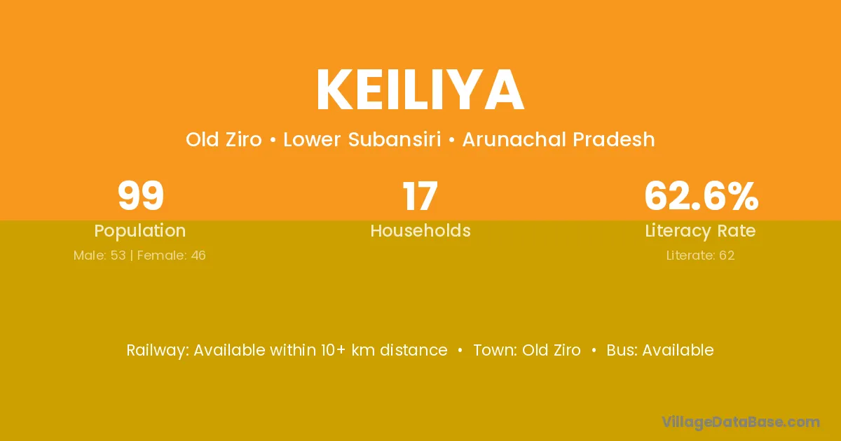 Keiliya village has a total population of 99 people, of which 53 are males and 46 are females.