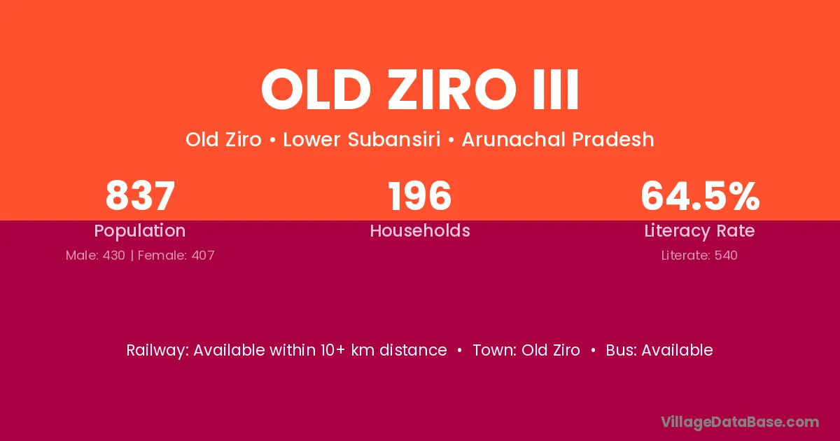 Old Ziro Iii village has a total population of 837 people, of which 430 are males and 407 are females.