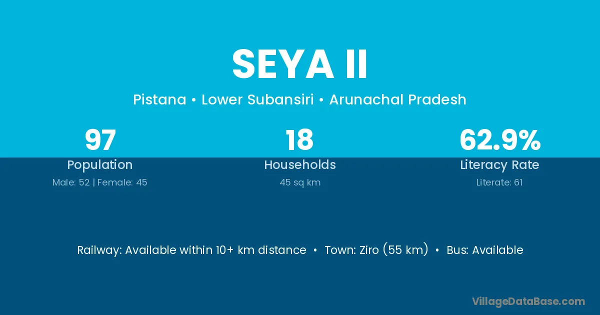 Ziro (55 km) is the nearest town to Seya Ii village for major economic activities and is located approximately 55 km away.