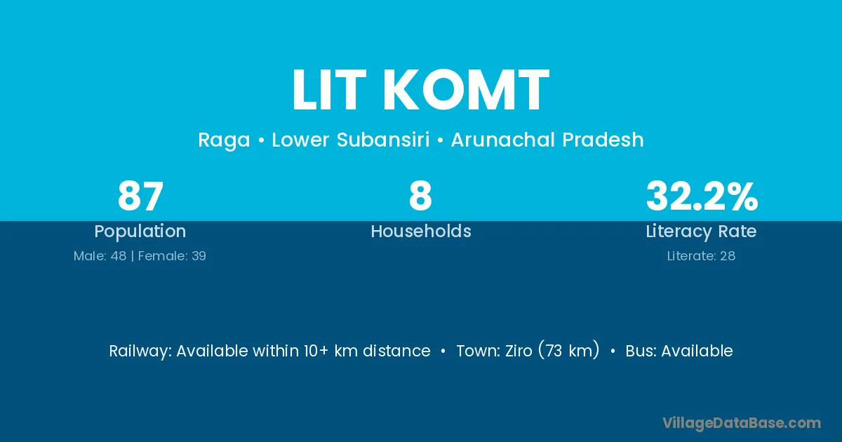 Ziro (73 km) is the nearest town to Lit Komt village for major economic activities and is located approximately 73 km away.