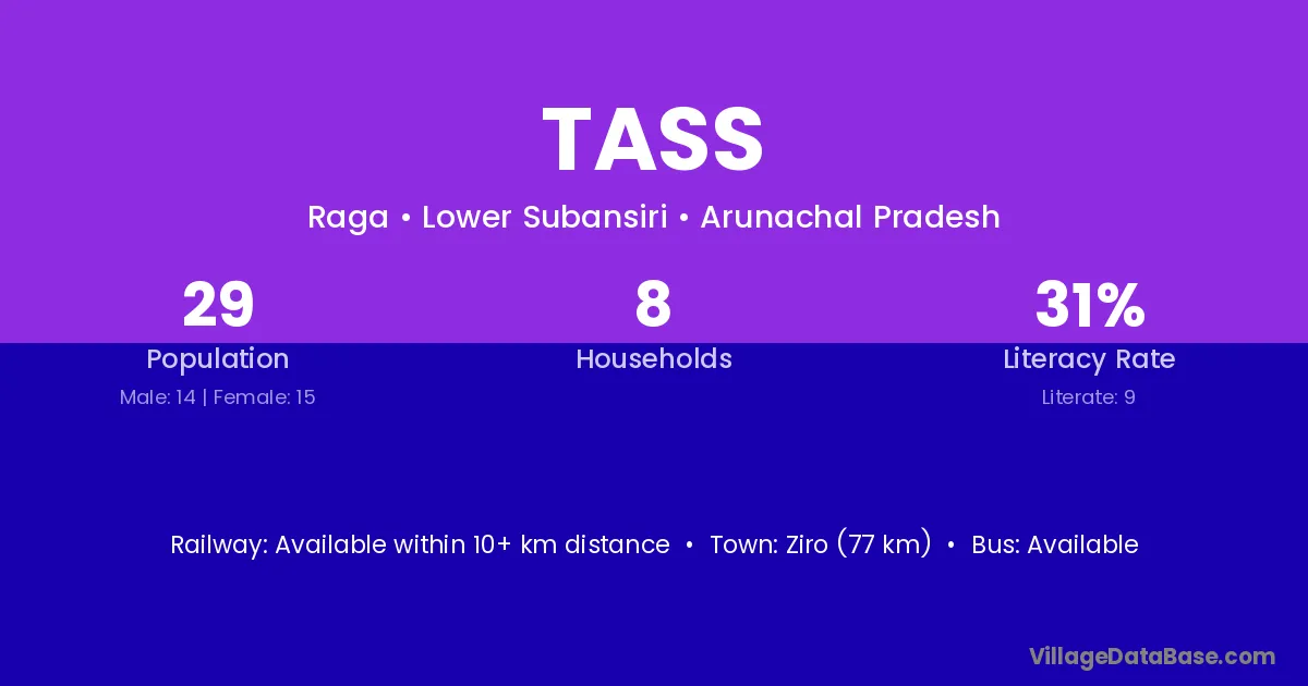 Ziro (77 km) is the nearest town to Tass village for major economic activities and is located approximately 77 km away.