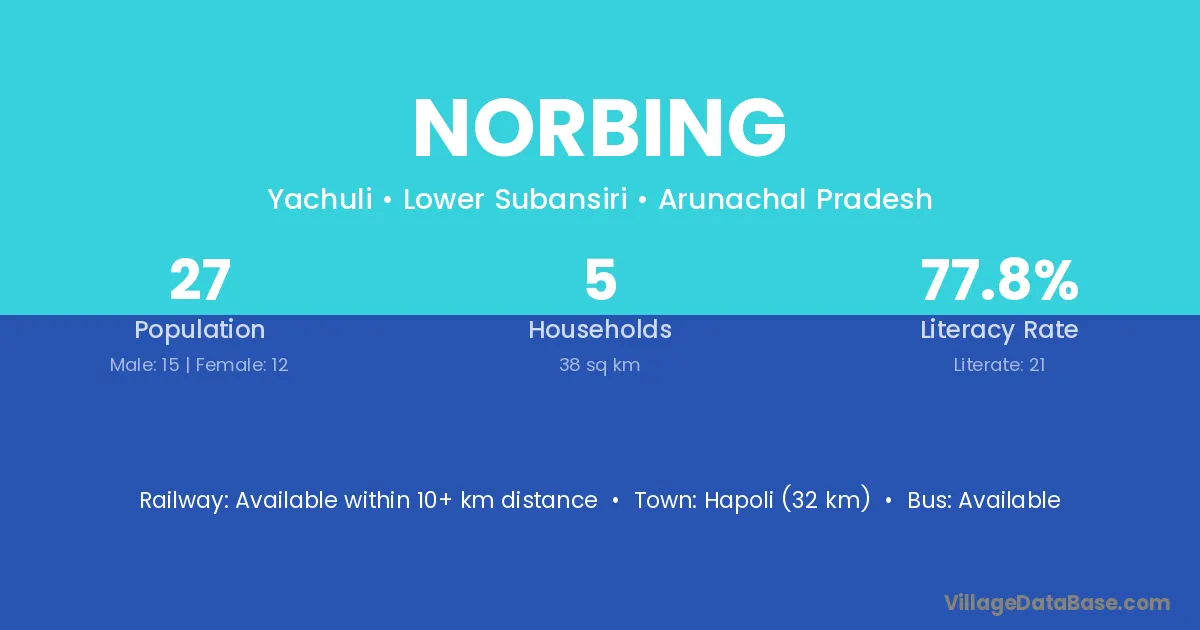 Hapoli (32 km) is the nearest town to Norbing village for major economic activities and is located approximately 32 km away.