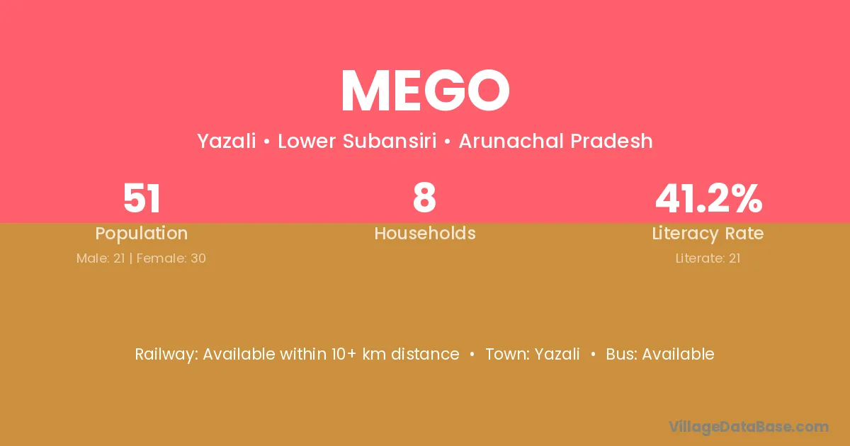 Mego village has a total population of 51 people, of which 21 are males and 30 are females.