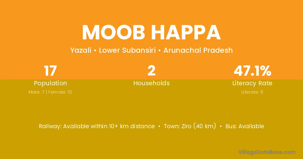 Ziro (40 km) is the nearest town to Moob Happa village for major economic activities and is located approximately 40 km away.