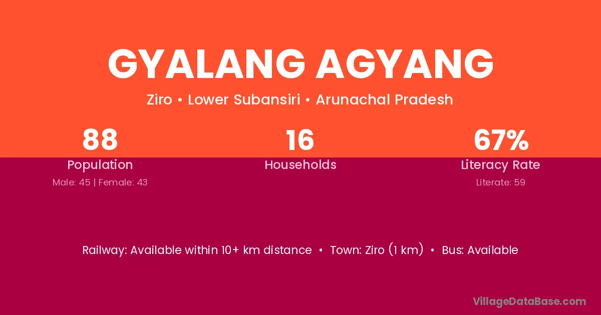 Gyalang Agyang village has a total population of 88 people, of which 45 are males and 43 are females.