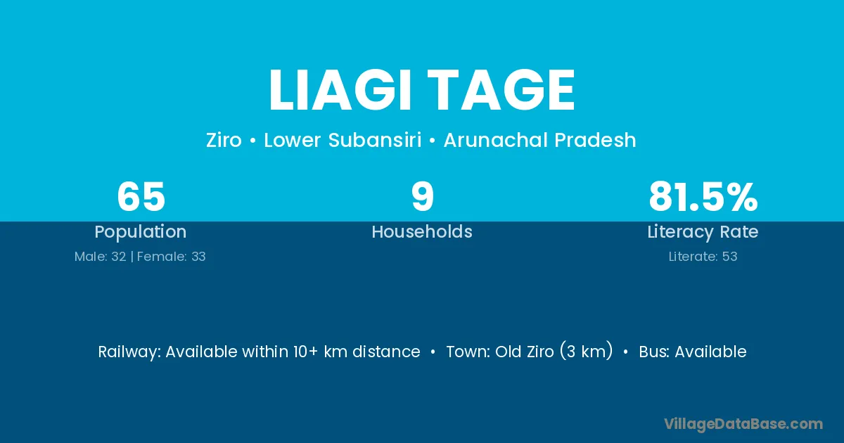 Old Ziro (3 km) is the nearest town to Liagi Tage village for major economic activities and is located approximately 3 km away.