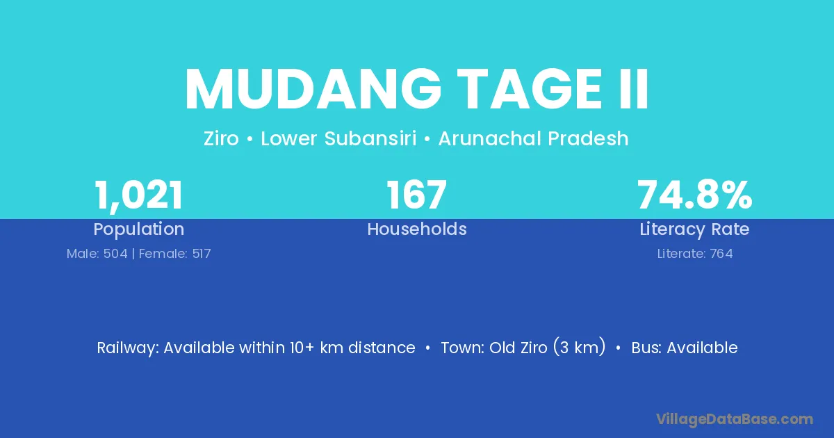 Mudang Tage Ii village has a total population of 1,021 people, of which 504 are males and 517 are females.