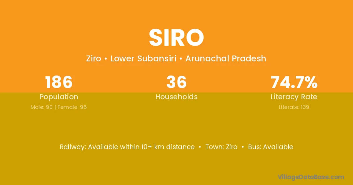 The literacy rate of Siro village is 74.73%. Male literacy stands at 83.33% and female literacy at 66.67%.