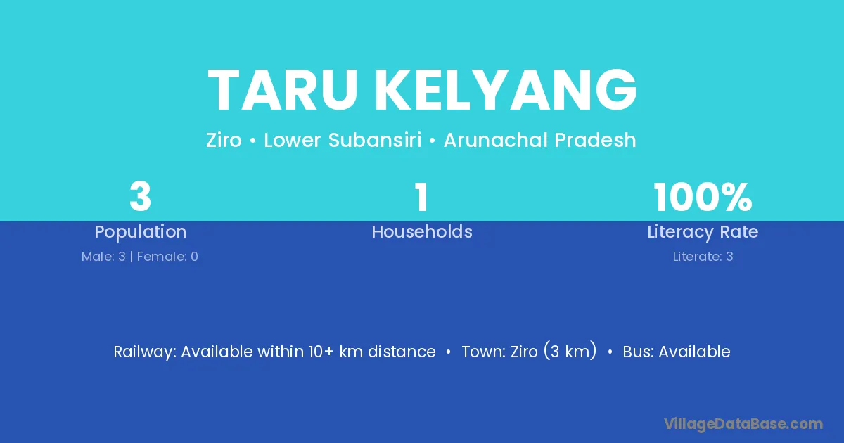 Ziro (3 km) is the nearest town to Taru Kelyang village for major economic activities and is located approximately 3 km away.