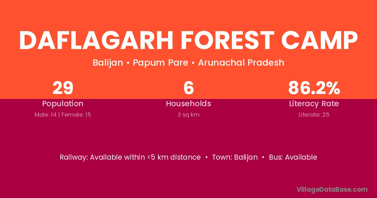 Daflagarh Forest Camp village has a total population of 29 people, of which 14 are males and 15 are females.