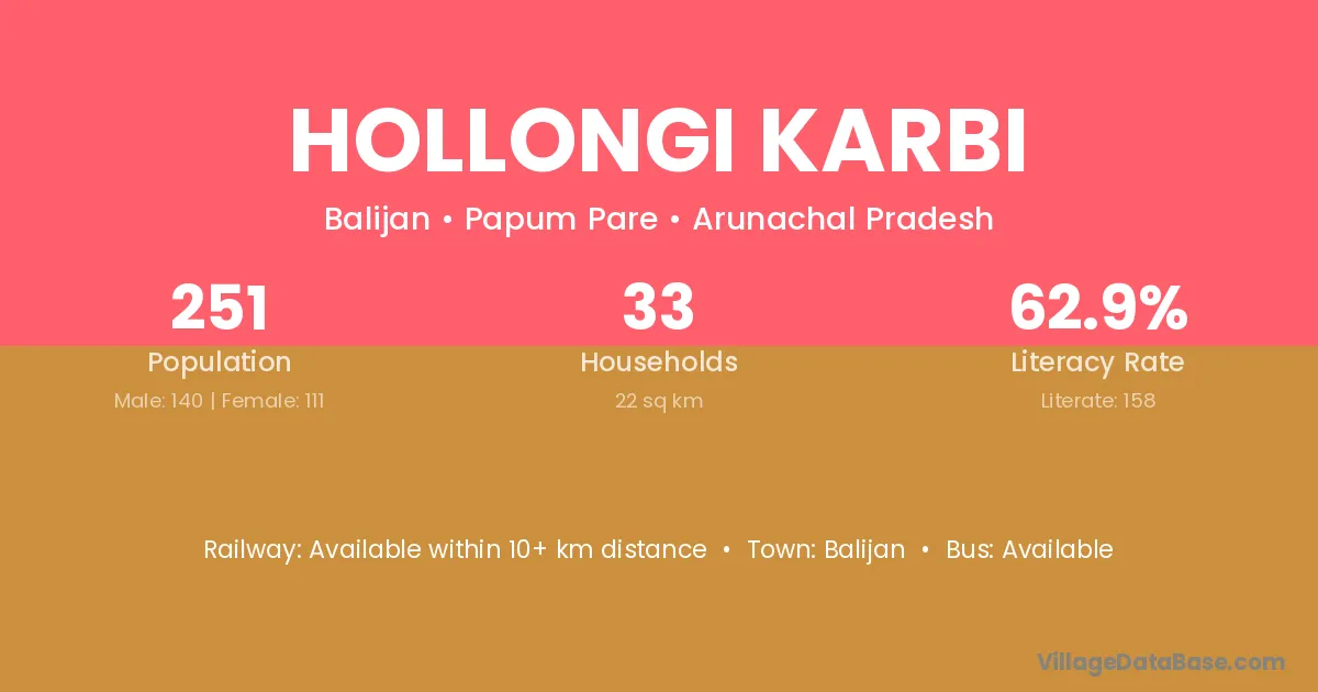 Hollongi Karbi village has a total population of 251 people, of which 140 are males and 111 are females.